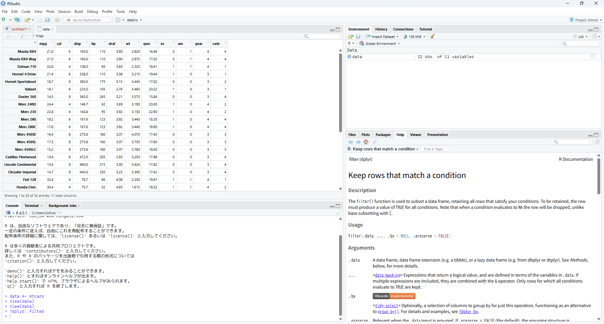 例えば、dplyrパッケージのfilter()関数のドキュメントを見たい場合、以下のように入力します4。
