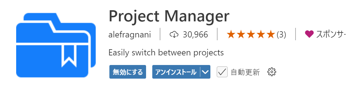 をクリックし、検索窓に「alefragnani.project-manager」と入力します。 - 出てきた拡張機能(Project Manager)をインストールします。
