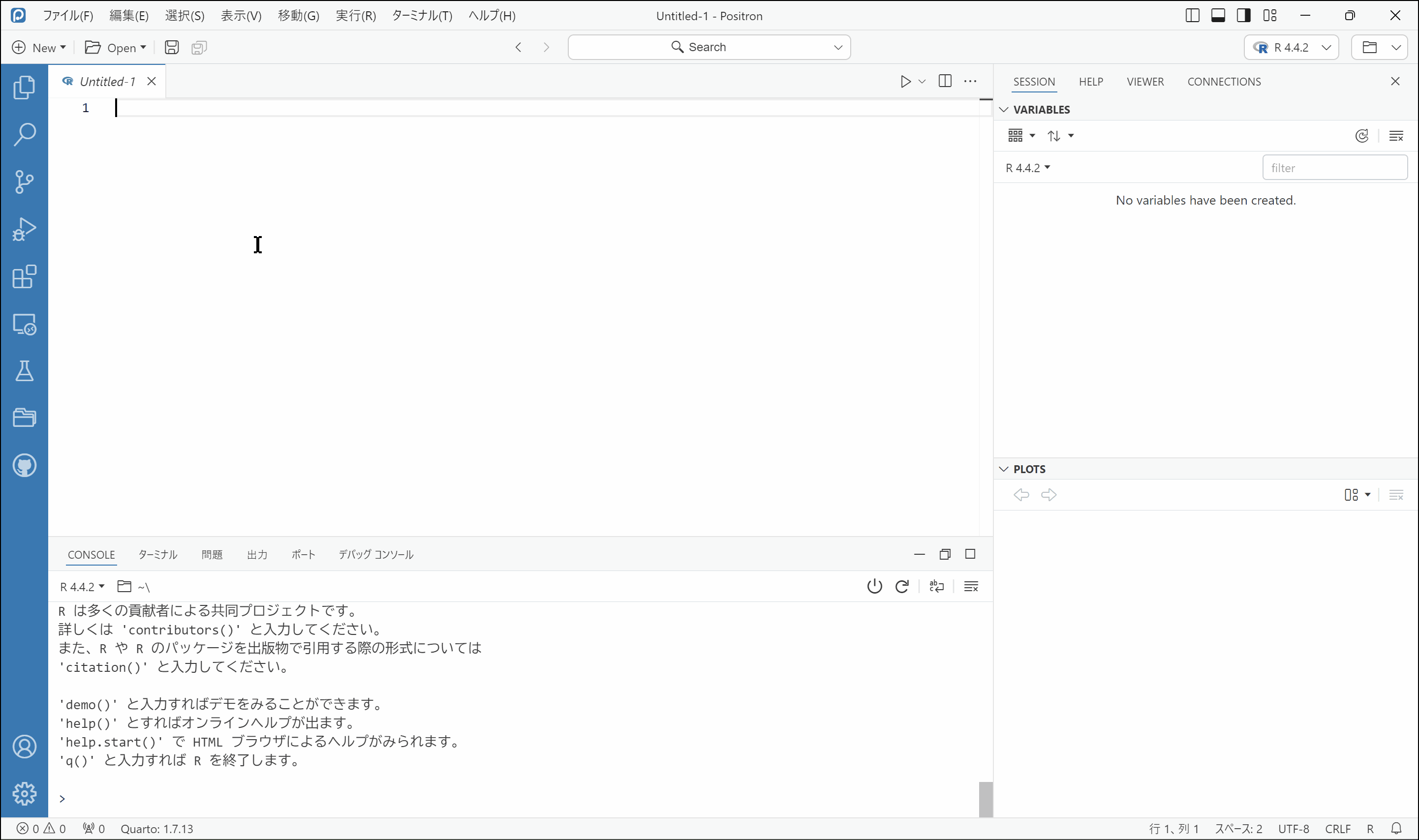 基本的な実行方法はRStudioと同じです。RStudioと違ってRunですぐ実行というわけにはいかないので、Ctrl + Enterで実行するのがよいかもしれません。