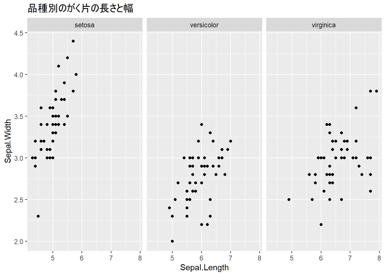 1つの変数でグラフを分割します。facet_wrap(~ 変数)で、指定した変数のカテゴリごとにグラフが作成されます。