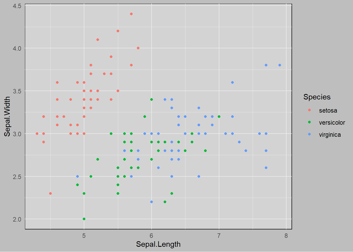 ggplot(iris, aes(x = Sepal.Length, y = Sepal.Width, color = Species)) +