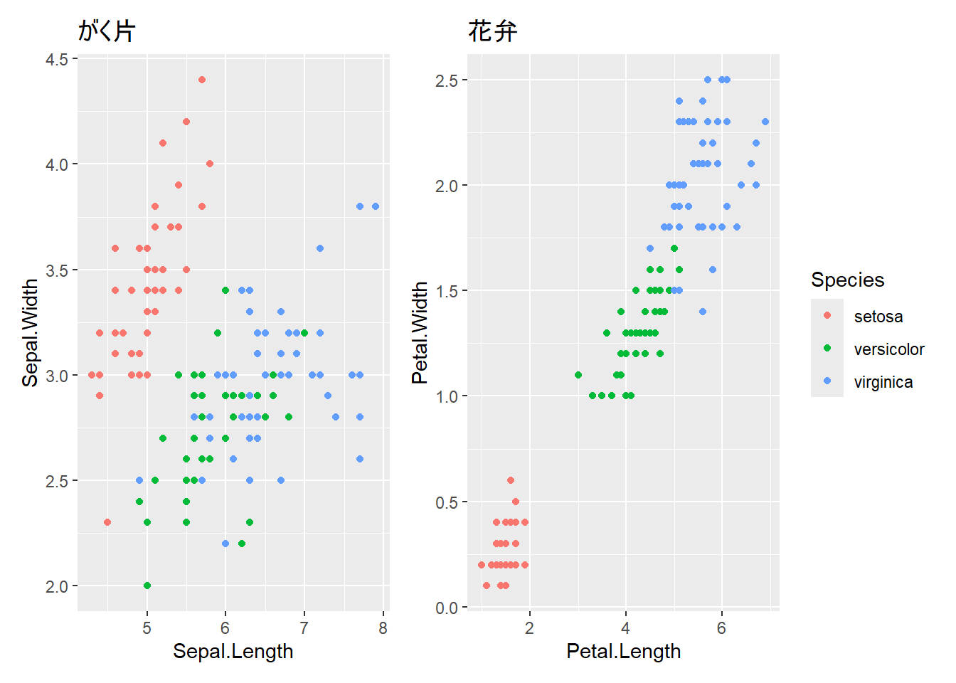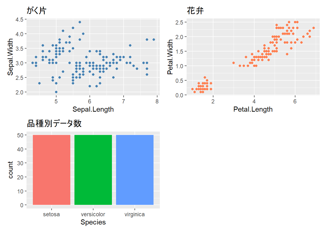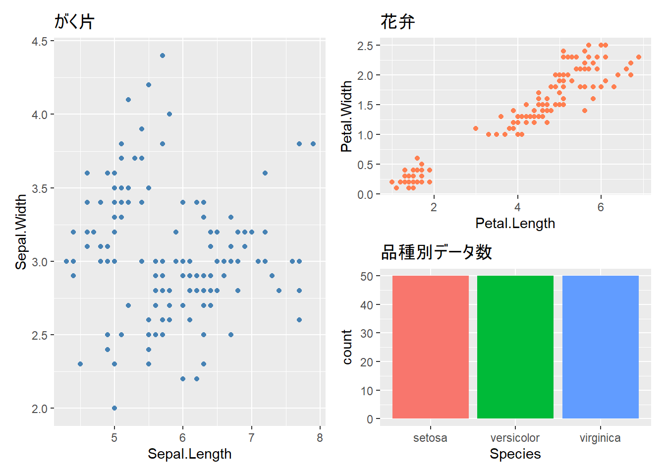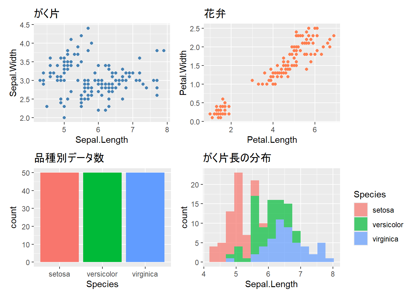 labs(title = "がく片長の分布")+演算子を使うと、グラフを横に並べることができます。