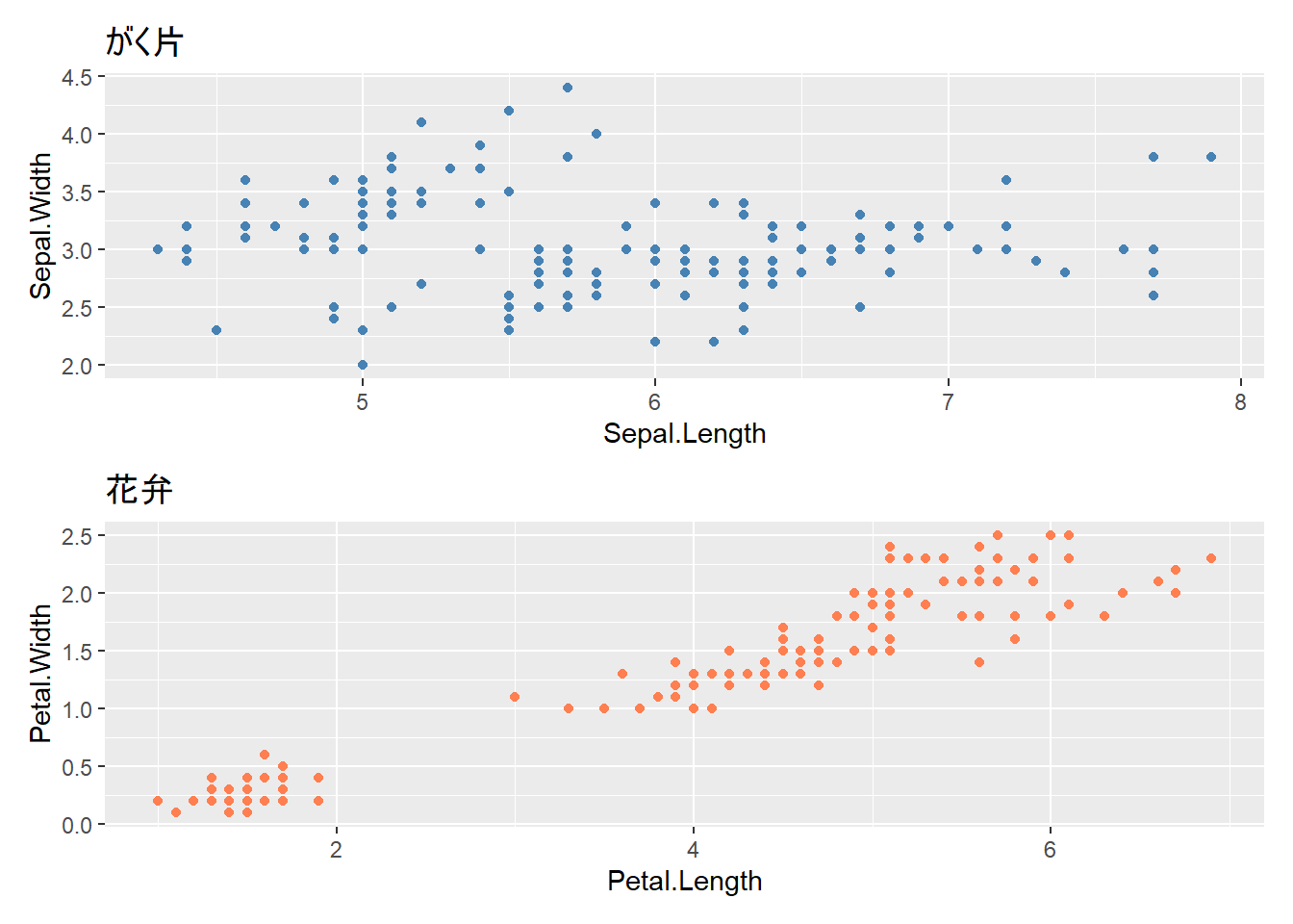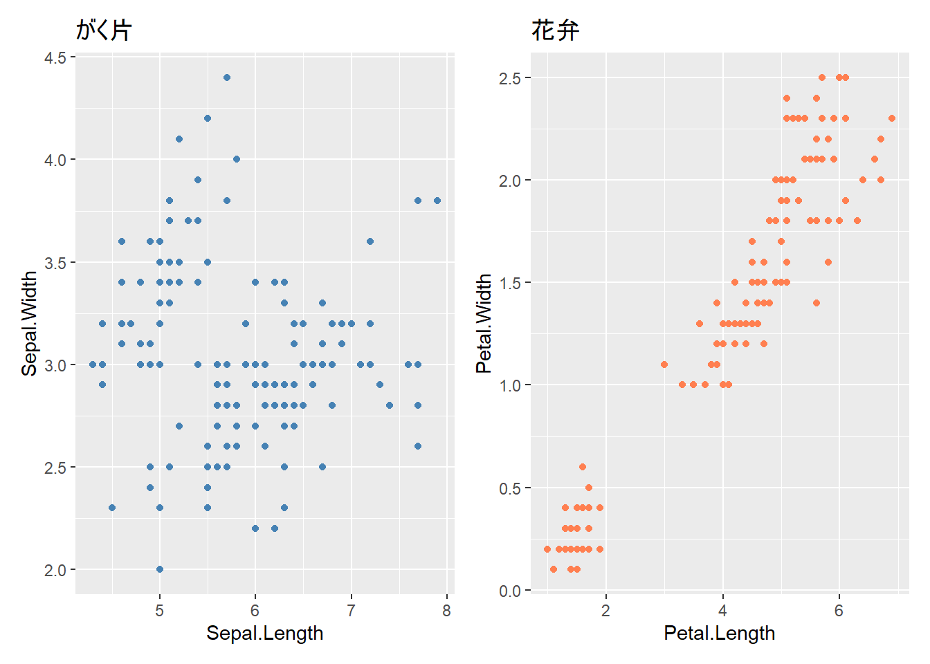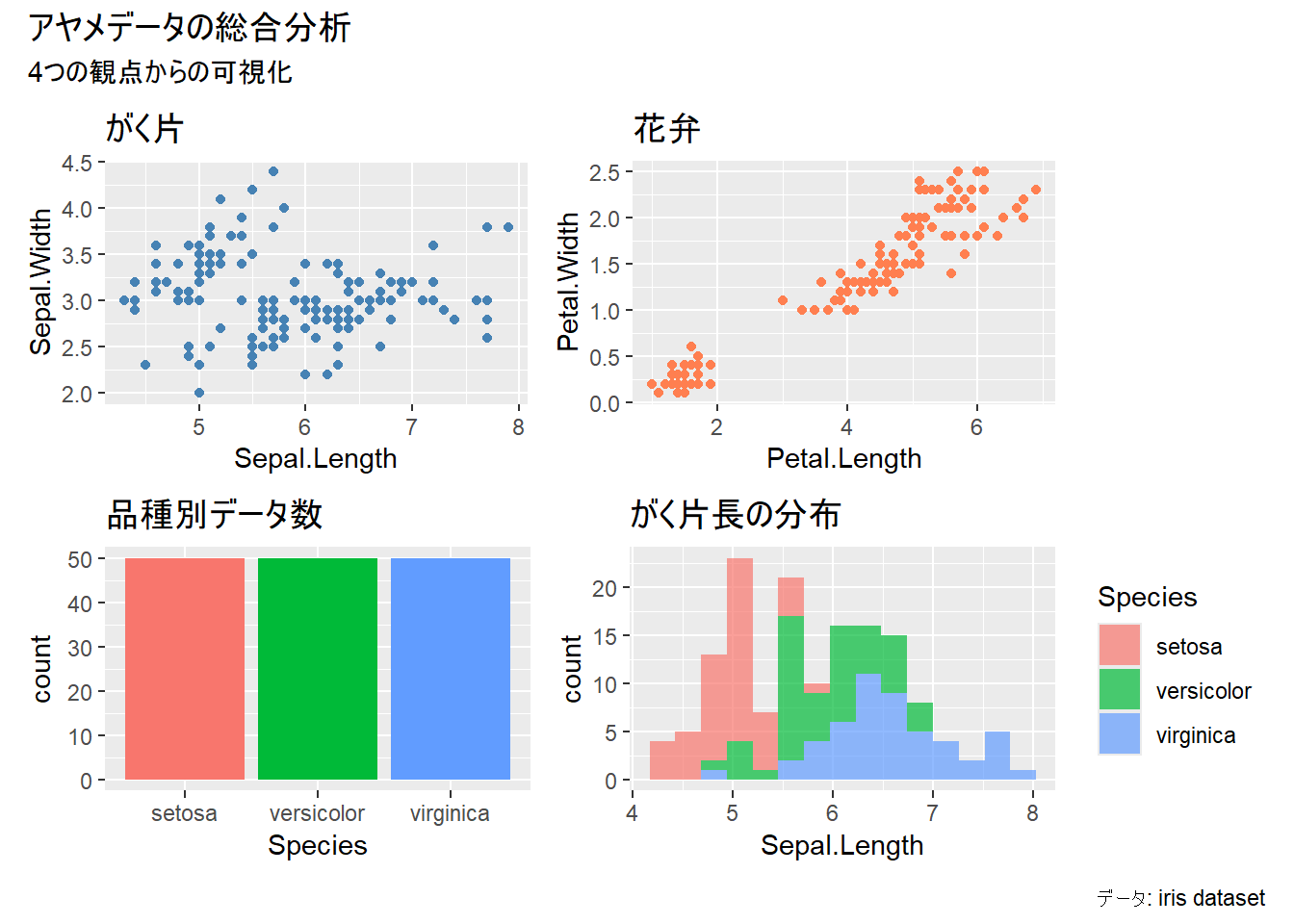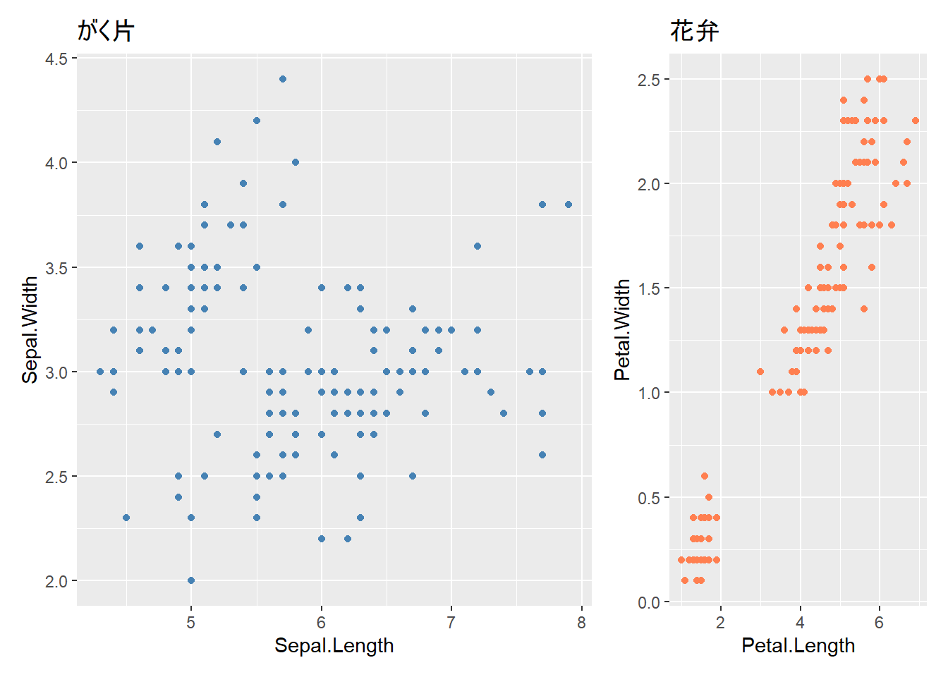 labs(title = "がく片長の分布")+演算子を使うと、グラフを横に並べることができます。