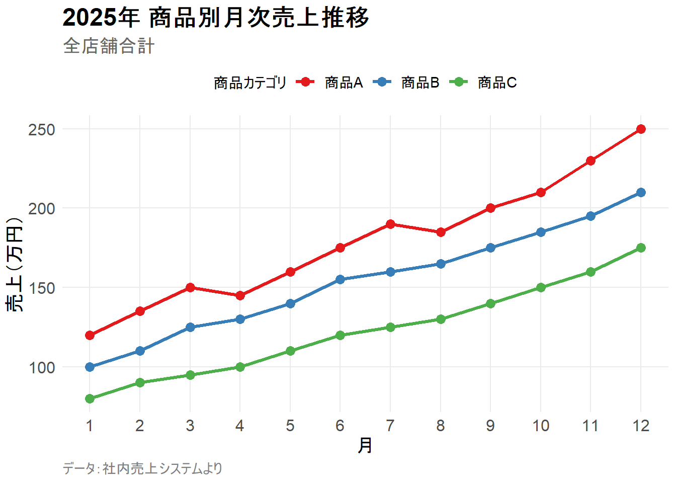 final_plot <- ggplot(sales_summary, aes(x = 月, y = 売上, color = 商品)) +