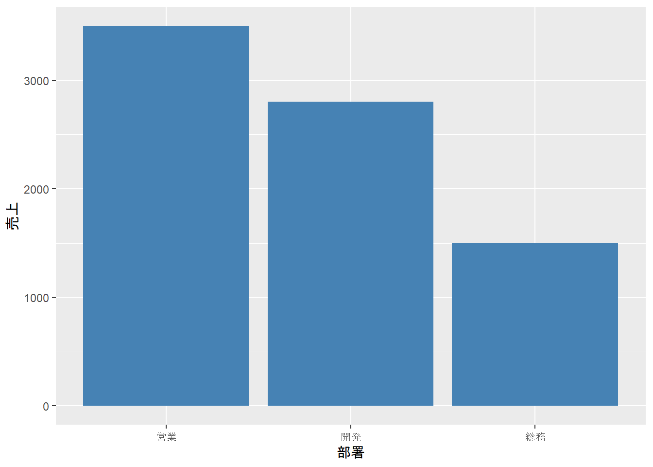 ggplot(data = dept_sales, aes(x = 部署, y = 売上)) +