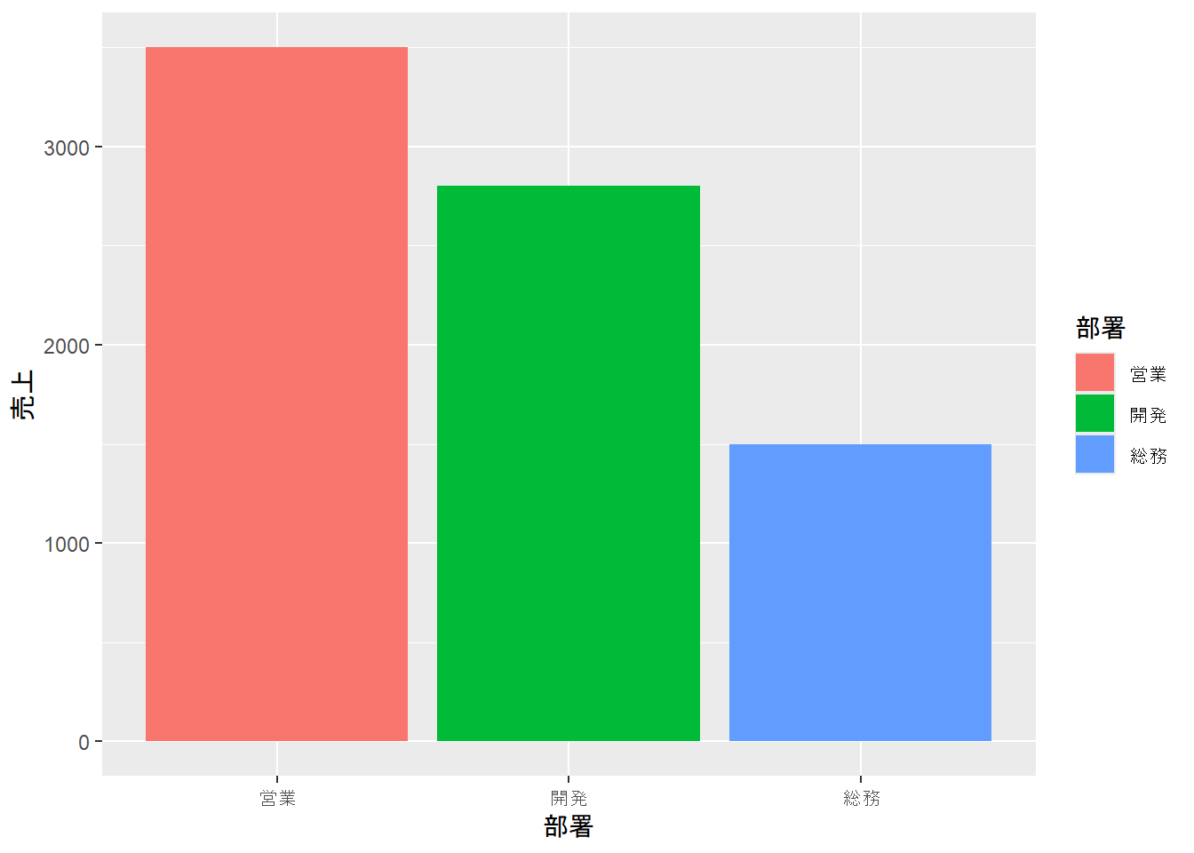 ggplot(data = dept_sales, aes(x = 部署, y = 売上, fill = 部署)) +