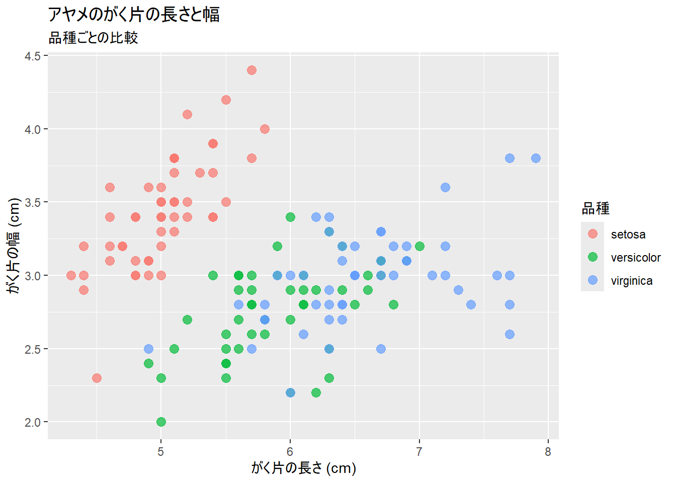 ggsave("outputs/iris_plot.png", plot = my_plot, width = 8, height = 6)irisデータで、Petal.Length(x軸)とPetal.Width(y軸)の散布図を作成してください。点は品種ごとに色分けしてください。