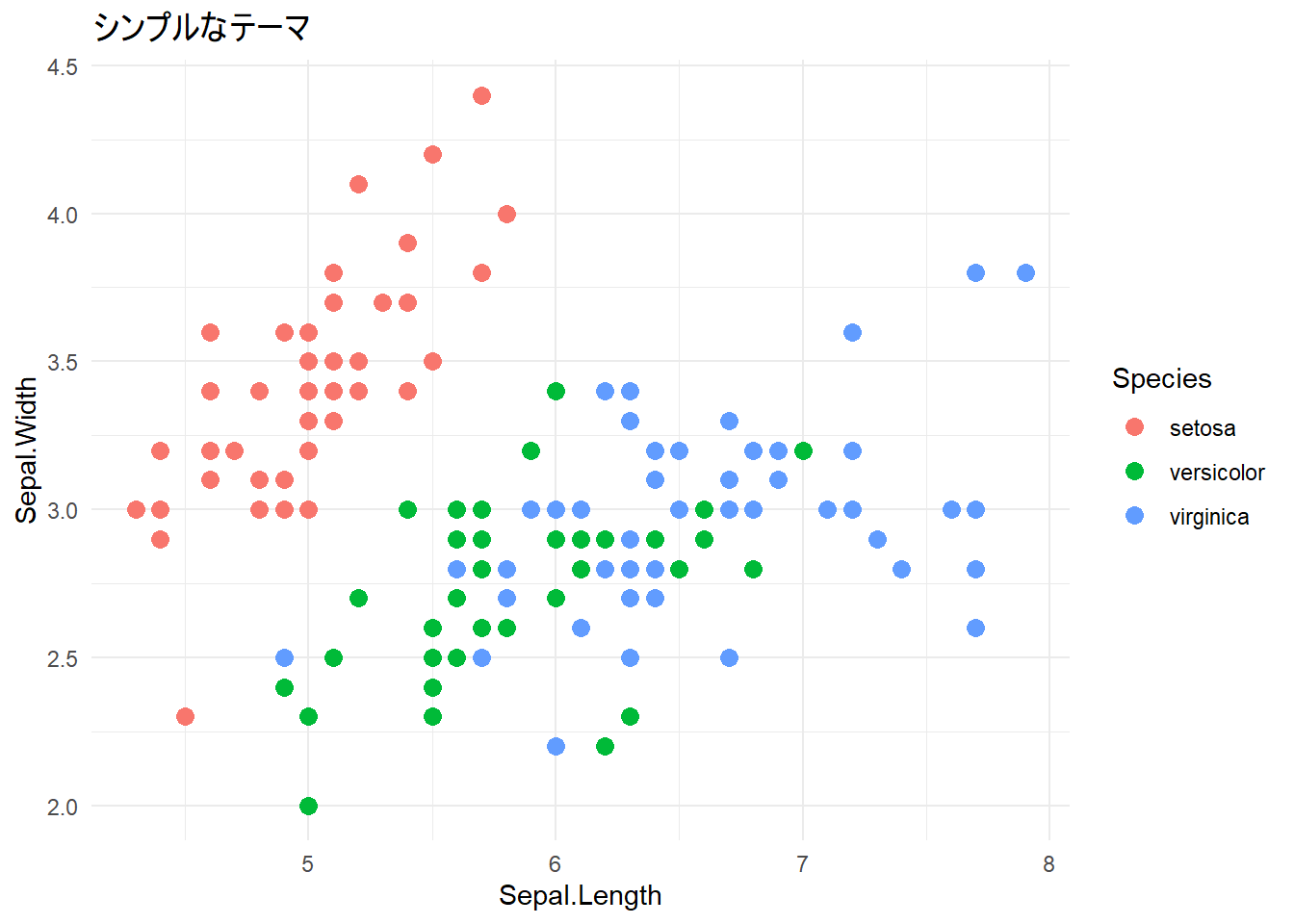 theme_bw(): 白黒テーマtheme_dark(): 暗いテーマtheme_light(): 明るいテーマtheme_void(): 軸や背景を削除これまで学んだ要素を組み合わせて、見やすいグラフを作成してみましょう。