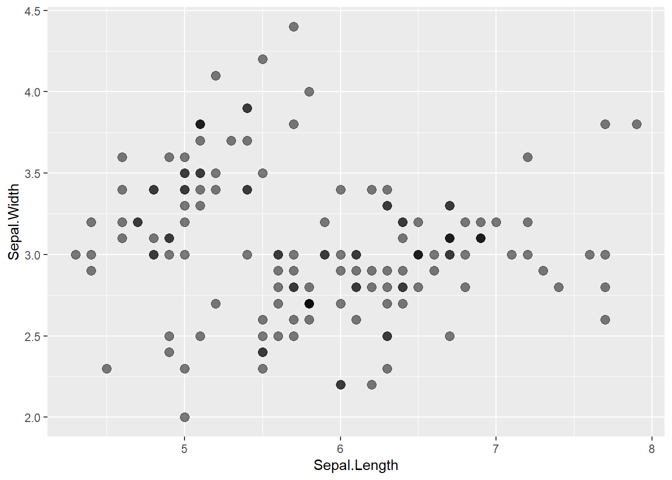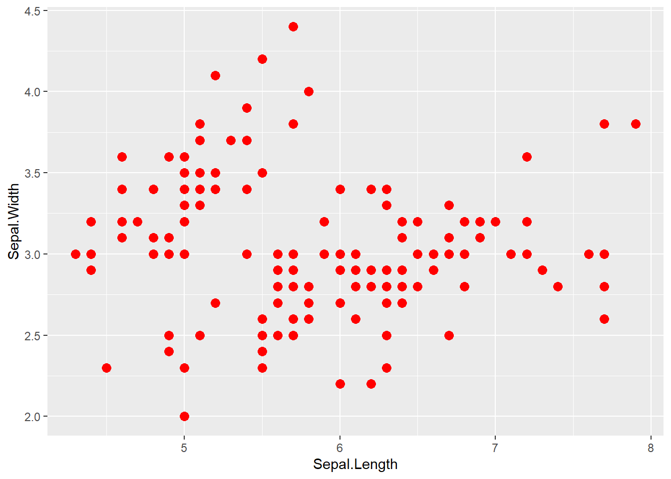 ggplot(data = iris, aes(x = Sepal.Length, y = Sepal.Width)) +