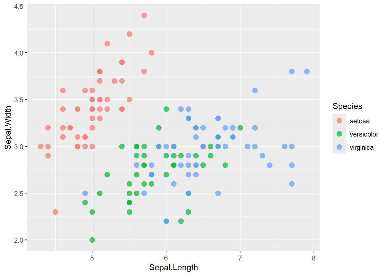 ggplot(data = iris, aes(x = Sepal.Length, y = Sepal.Width, color = Species)) +