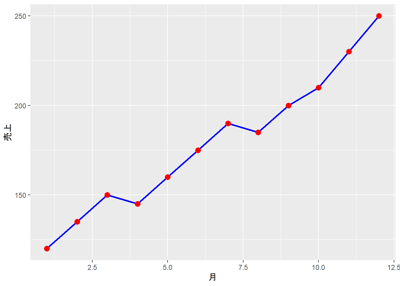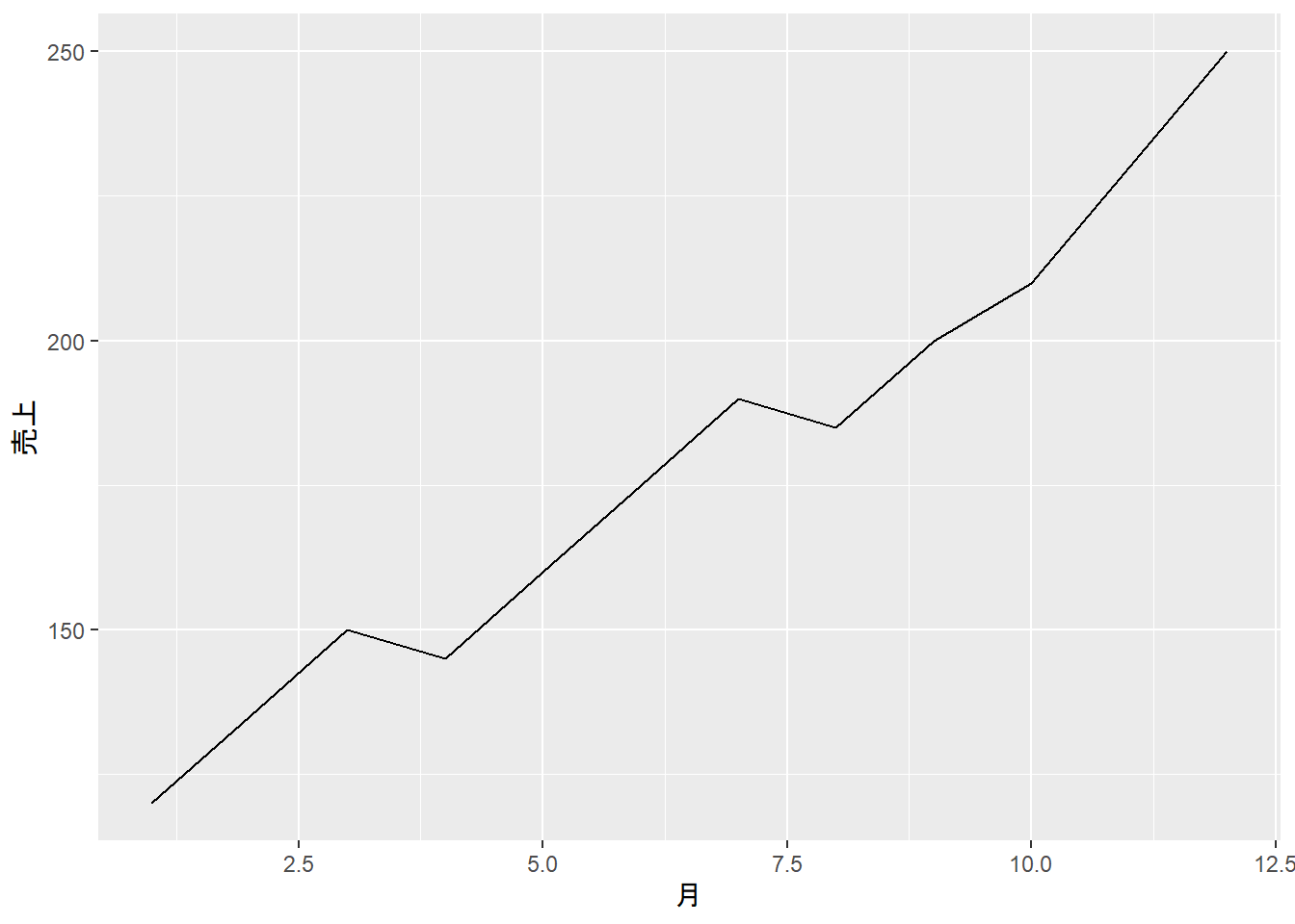 )ggplot(data = monthly_sales, aes(x = 月, y = 売上)) +