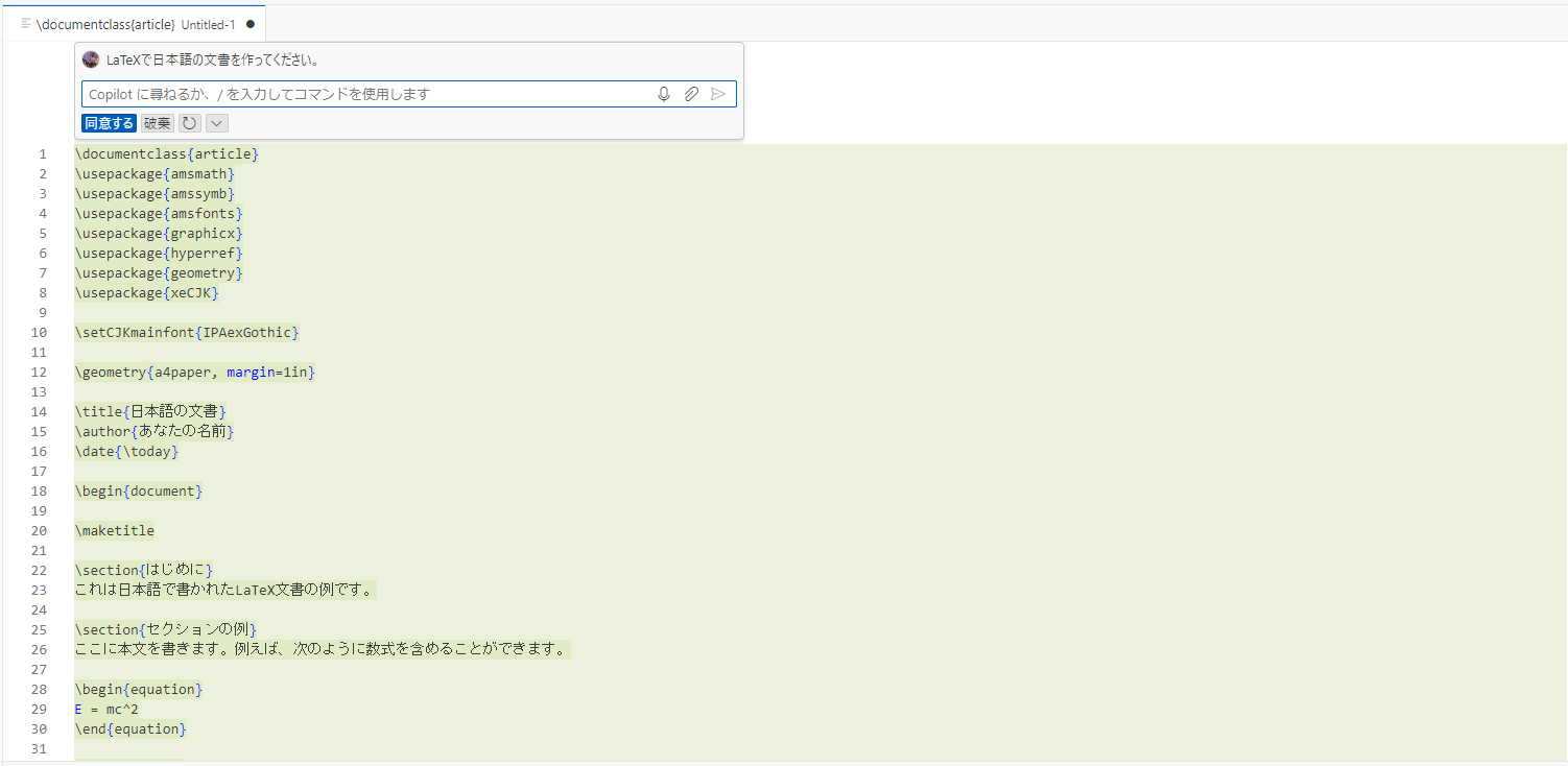 いい感じに出してくれた。出してくれたコードにカーソルを合わせると星マークのようなものが出てくるが、それは「エディターで適用します」であり、クリックすれば書いていた文書にそのコードを適用してくれる。