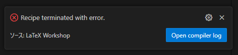 コンパイルすると右下にエラーの表記とともに「Open compiler log」と出ると思うので、それをクリックしてエラーログを開きます。