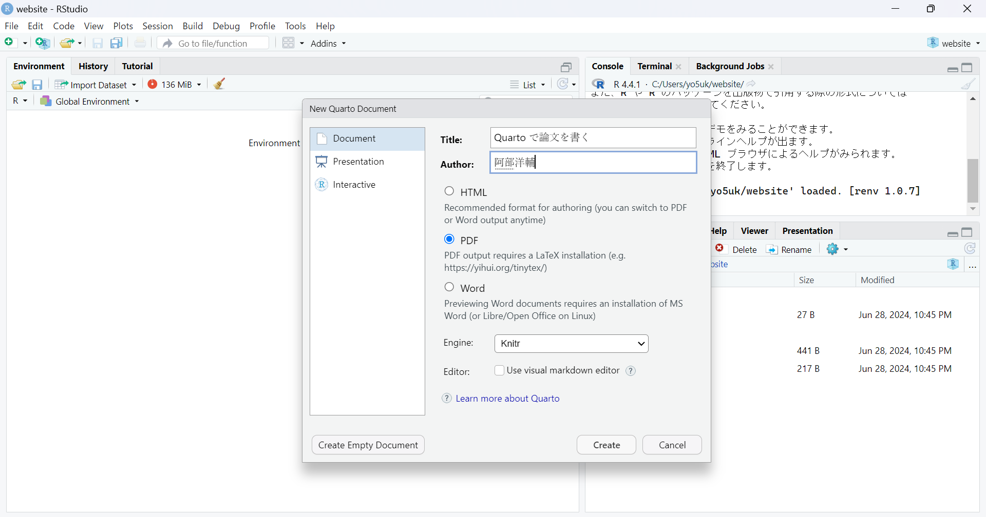 Quarto で論文を書くには、拡張子が .qmd のファイルを作成します。これは Quarto Markdown の略です。