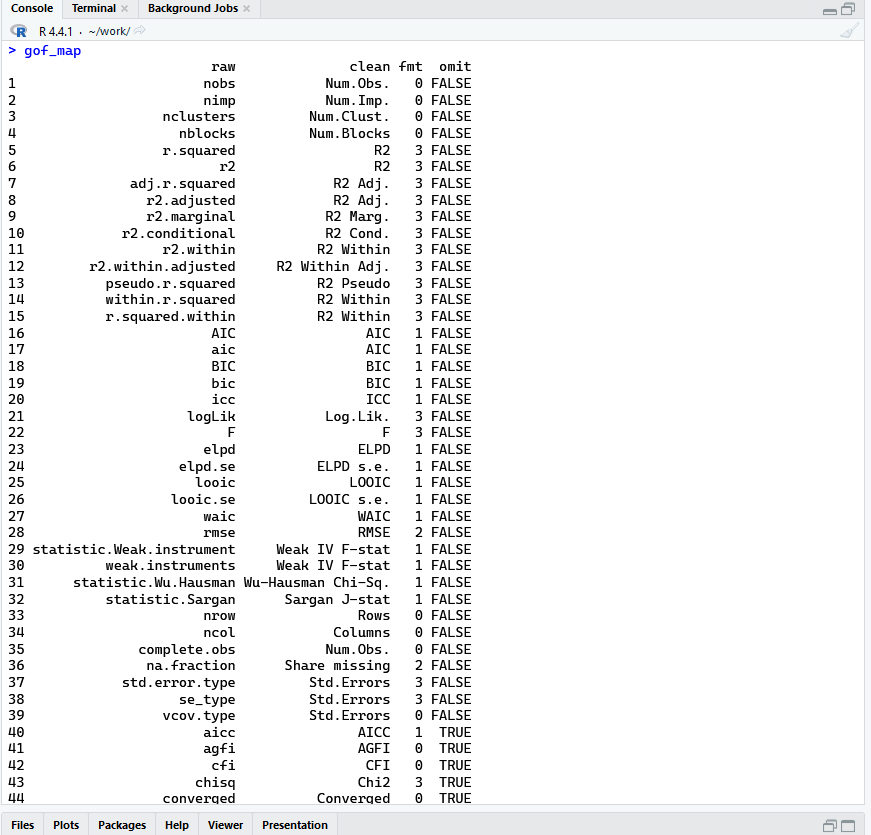 coef_mapとgof_map用のcm&gmcm6 は、分析で使用した変数名を書き換えて表に出すためのものです。"Sepal.Width" = "がく片の幅(cm)"は、 “Sepal.Width” という変数名を “がく片の幅(cm)” と表示することを意味します。gmは少し複雑です。コンソールでgof_mapと打ってみると、raw, clean, fmt, omit の4列が出てきます。raw が表示する統計量、clean がそれらを表示するテキスト、fmt は小数点以下の桁数で、これらをgmで編集するということです7。“R\u00B2” はユニコード文字で、2乗を \(\TeX\) 上で表すために使用しています。