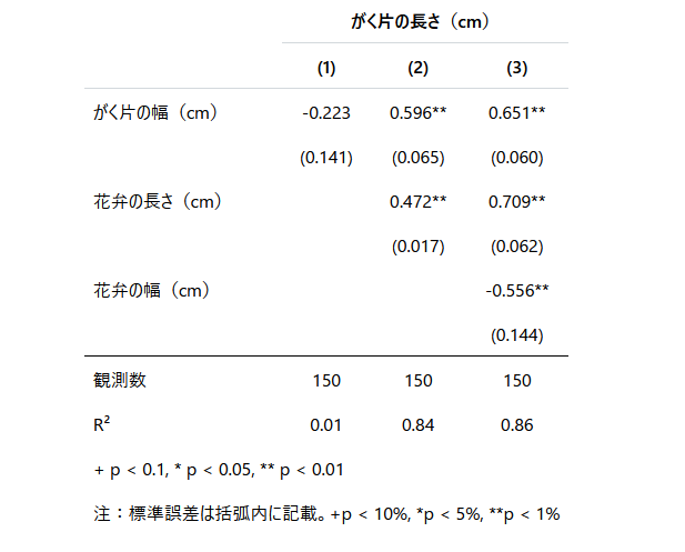 msummaryはmodelsummaryの関数です8。ここでは、regressionに格納した分析結果を表示しています。estimateで “{estimate}{stars}” と指定しています。これは推定値とその有意性を表示するためのものです。入れたパターンと入れないパターンで試してもらいたいのですが、有意性について別に脚注が入ってしまい、上で書いた脚注と合わせて2行になってしまうので、わざわざこの設定をしています。下の表を確認してください。notes,coef_map,gof_mapは上で設定したものを反映させています。starsは有意性の表示を設定しています。ここでは、+p < 10%, *p < 5%, **p < 1% としています。group_ttは表のグルーピングを行うためのものです。ここでは、被説明変数が全て “がく片の長さ(cm)” なので、それをグルーピングしています。1列目は変数名にあたるので、2:4 としています。group_ttの引数jは列のグルーピングで、i引数は行のグルーピングに対応しています。