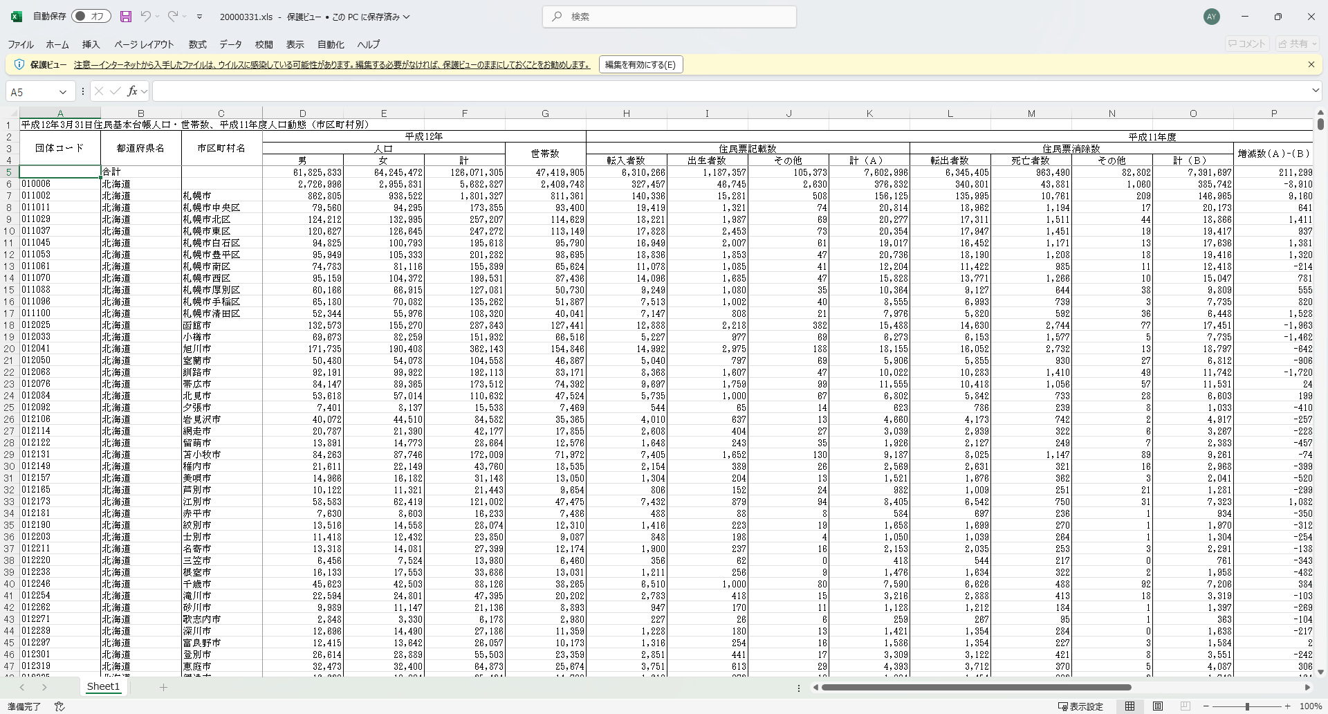 例えば人口データをパネル化したいとします。今回は例として、2000年から2005年の人口データ3を、2020年の市町村区分になるようにくっつけます。例なので、総人口のみを扱います。