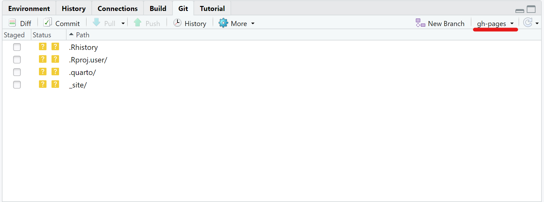 まず、RStudioのGit欄からすべての変更をコミットしておいてください。再度確認ですが、