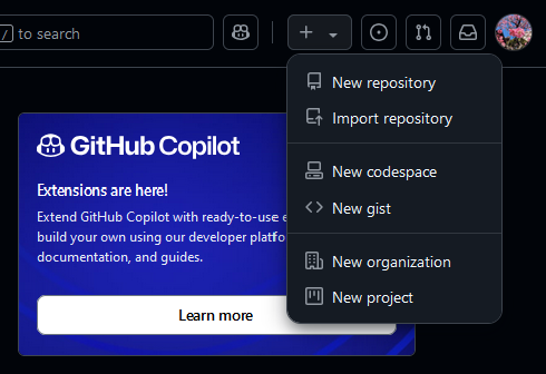 まず、GitHubホームの右上にあるプラスボタンから、New repositoryをクリックします。