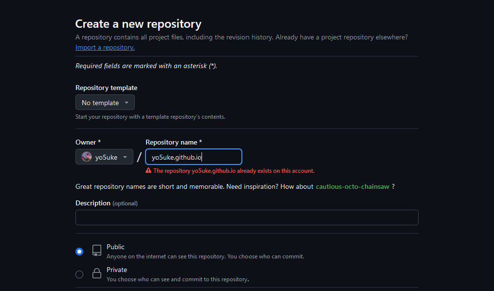 次に出てきた画面で、リポジトリ名を、「ユーザー名.github.io」という風に設定します。例えば僕のユーザー名はyo5ukeなので、yo5uke.github.ioといった感じです。