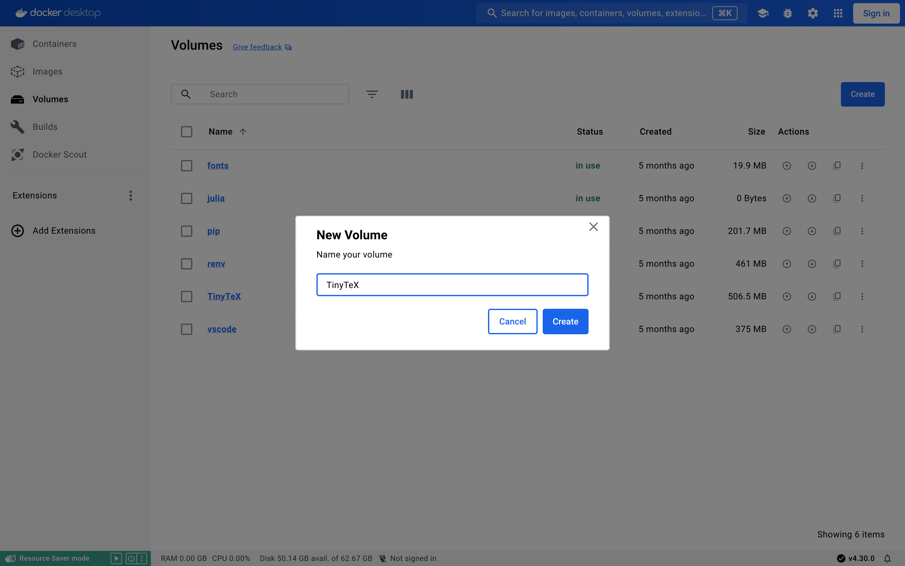 - 画面左側のVolumesに進み、Createからボリュームを作成