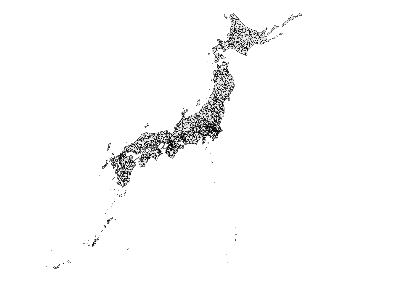[国土数値情報ダウンロードサイト](https://nlftp.mlit.go.jp/ksj/gml/datalist/KsjTmplt-N03-2024.html)から行政区域データをとってきて使用しているのですが、データを読み込むだけでも時間がかかるため、`rmapshaper`パッケージを使用して軽量化することにしました。精度は落ちるのですがパッと見ただけでわかるような劣化ではなく、ファイルサイズも1/10以下になっているので、それを公開しておこうと思います。