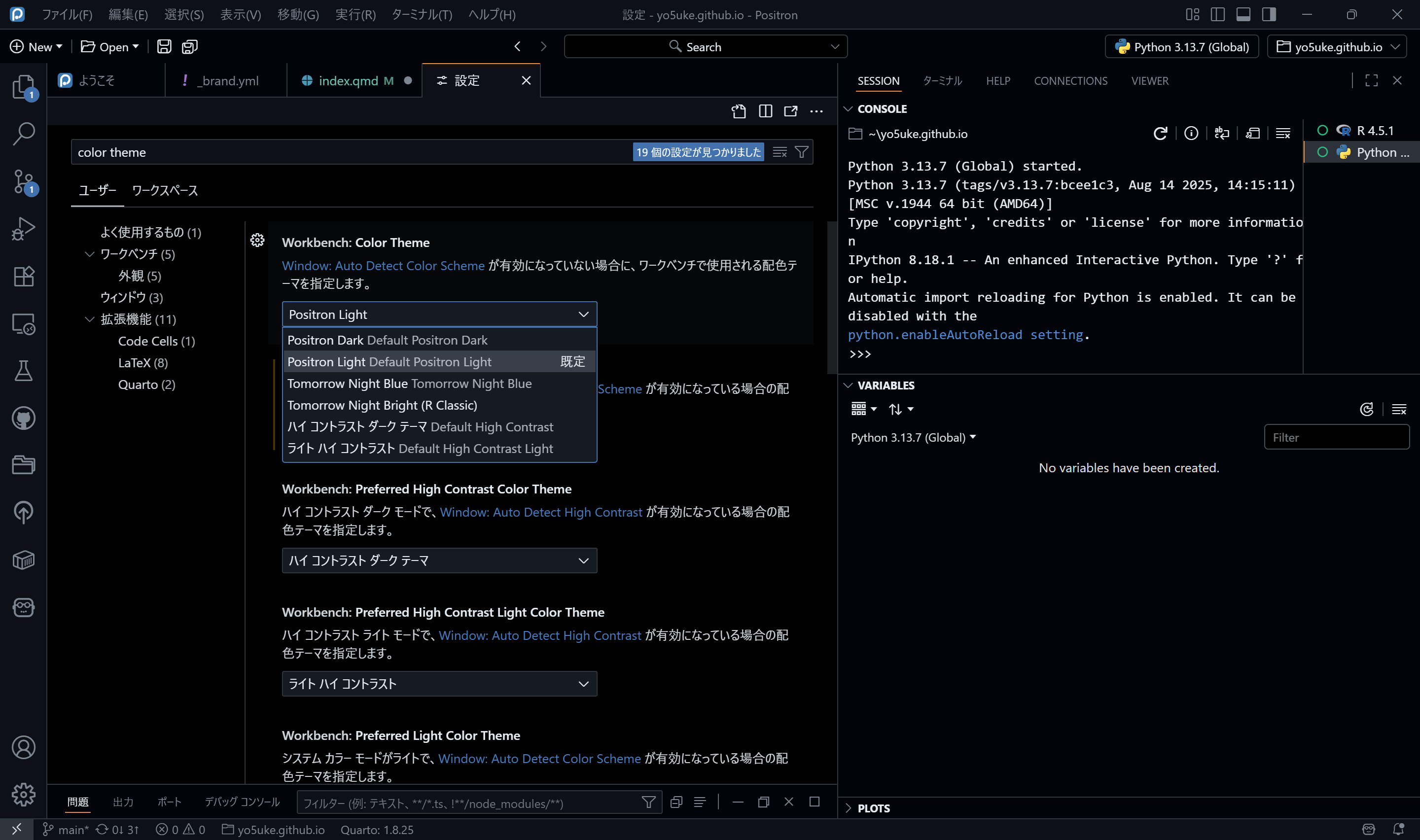 Positronではテーマも変更可能です。VSCodeと基本的な設定は同じですが、このセクションの終わりに拡張機能を利用したテーマの変更方法も書いておきます。
