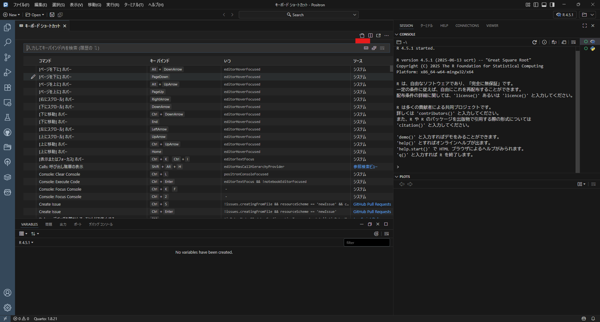 従来のVSCodeにおけるRの使い勝手はあまりよくないと個人的に感じており、例えばRStudioで使い慣れたキーボードショートカットを自分で設定しなければいけなかったり、環境変数(格納したデータ等)が見にくかったりしていましたが、PositronではRStudioの要素も取り入れつつ、これまでRStudioを使用していたユーザーにとって移行しやすいコーディング環境が提供されています2。