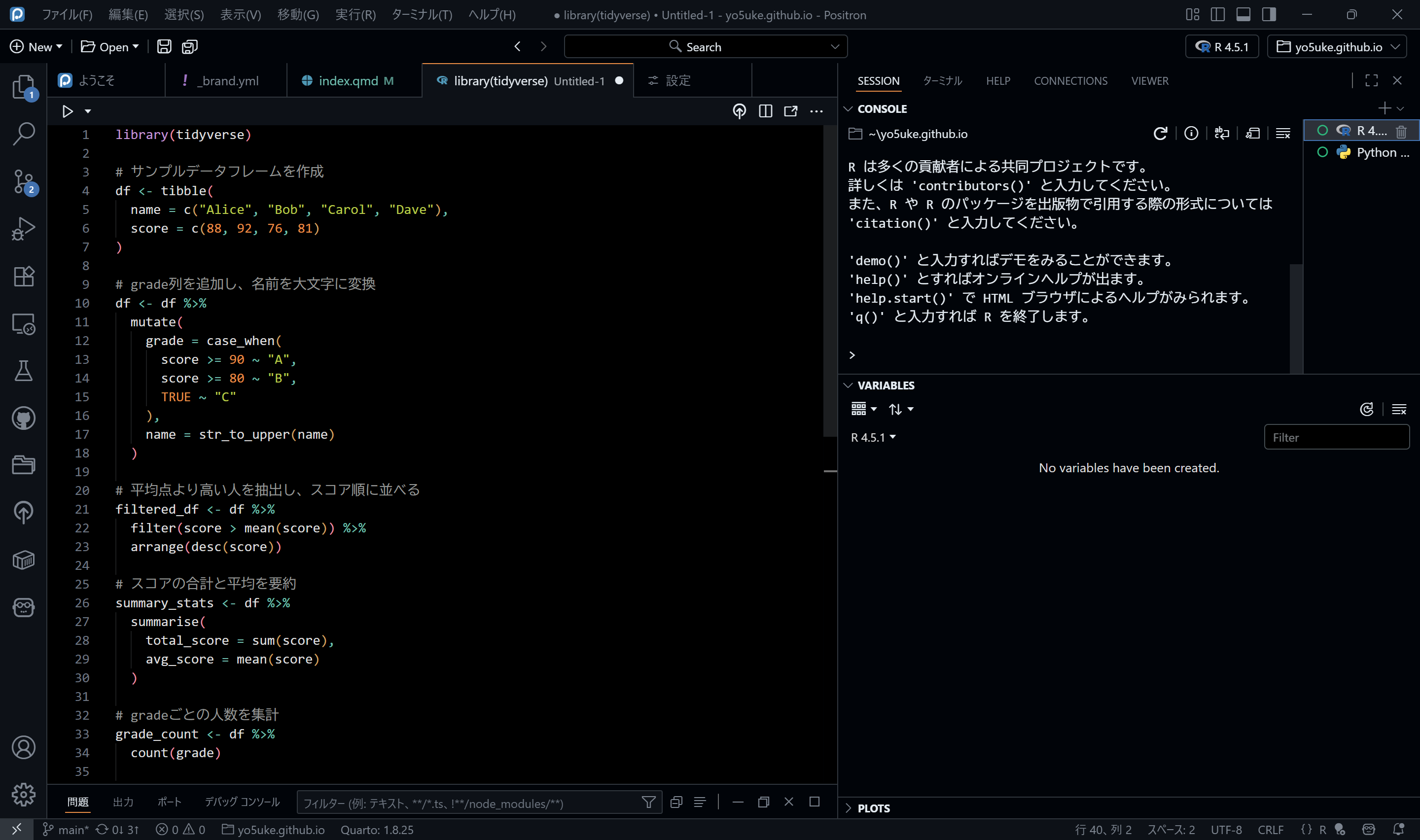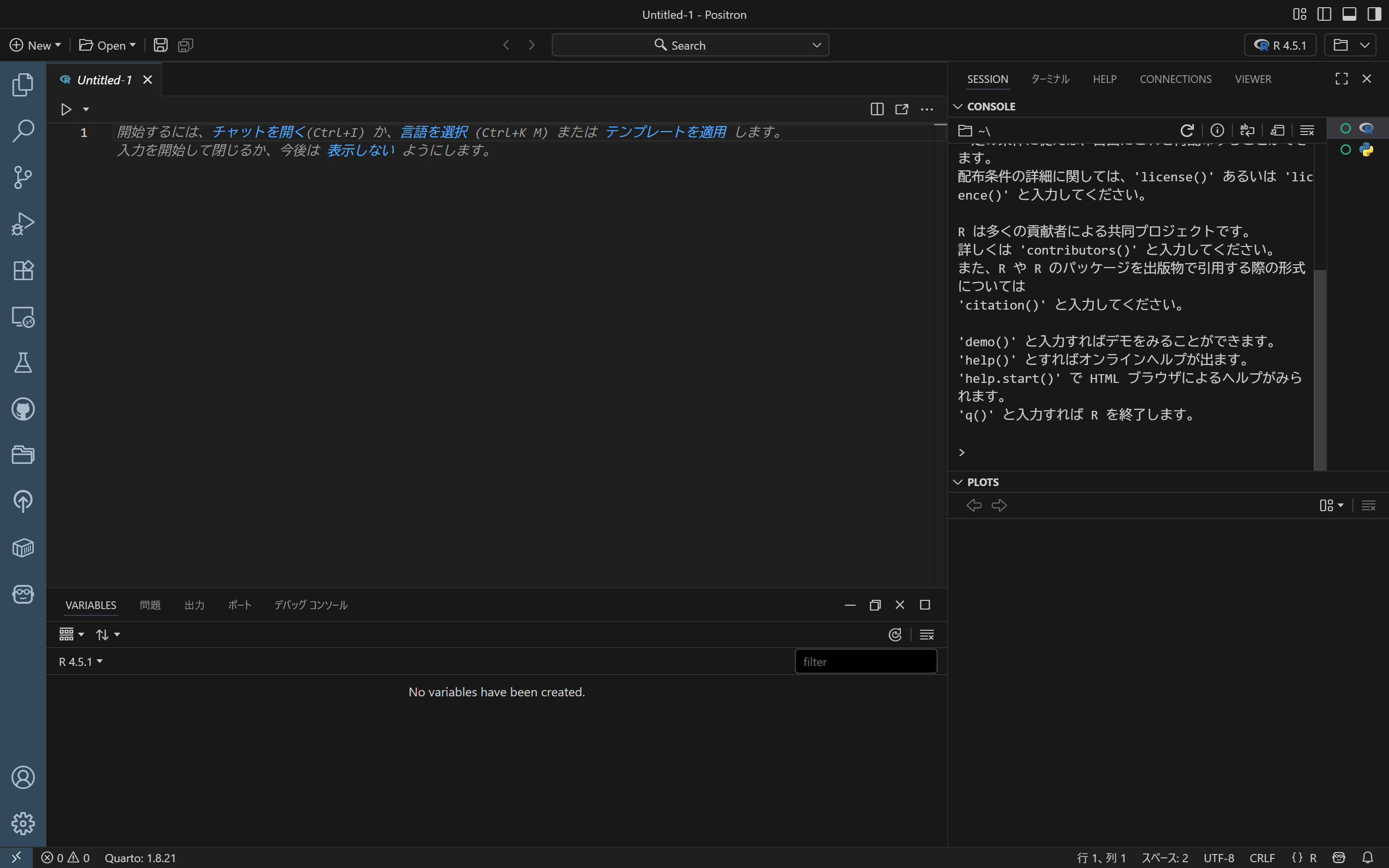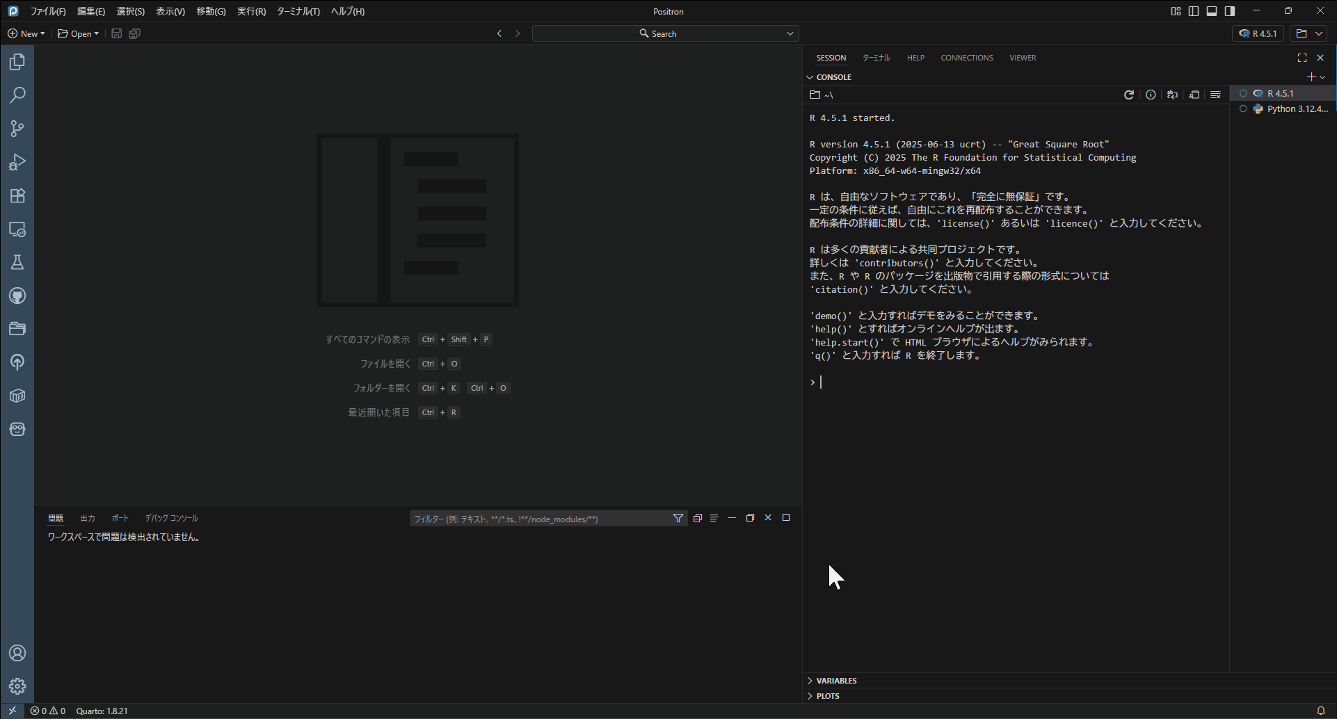 Positronの画面はこんな感じで、右上の「R 4.5.1」の部分からPythonへの切り替えも可能です。