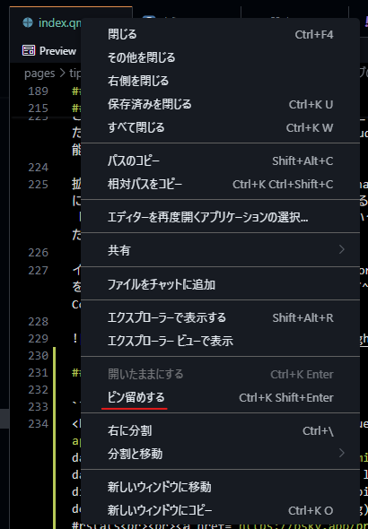 ピン留め自体は簡単にできます。タブを右クリックして「ピン留めする」をクリックするだけです。あるいはピン留めしたいタブを開いたうえでCtrl-K+Shift-EnterCtrl-K+Shift-Enterでもピン留めできます。