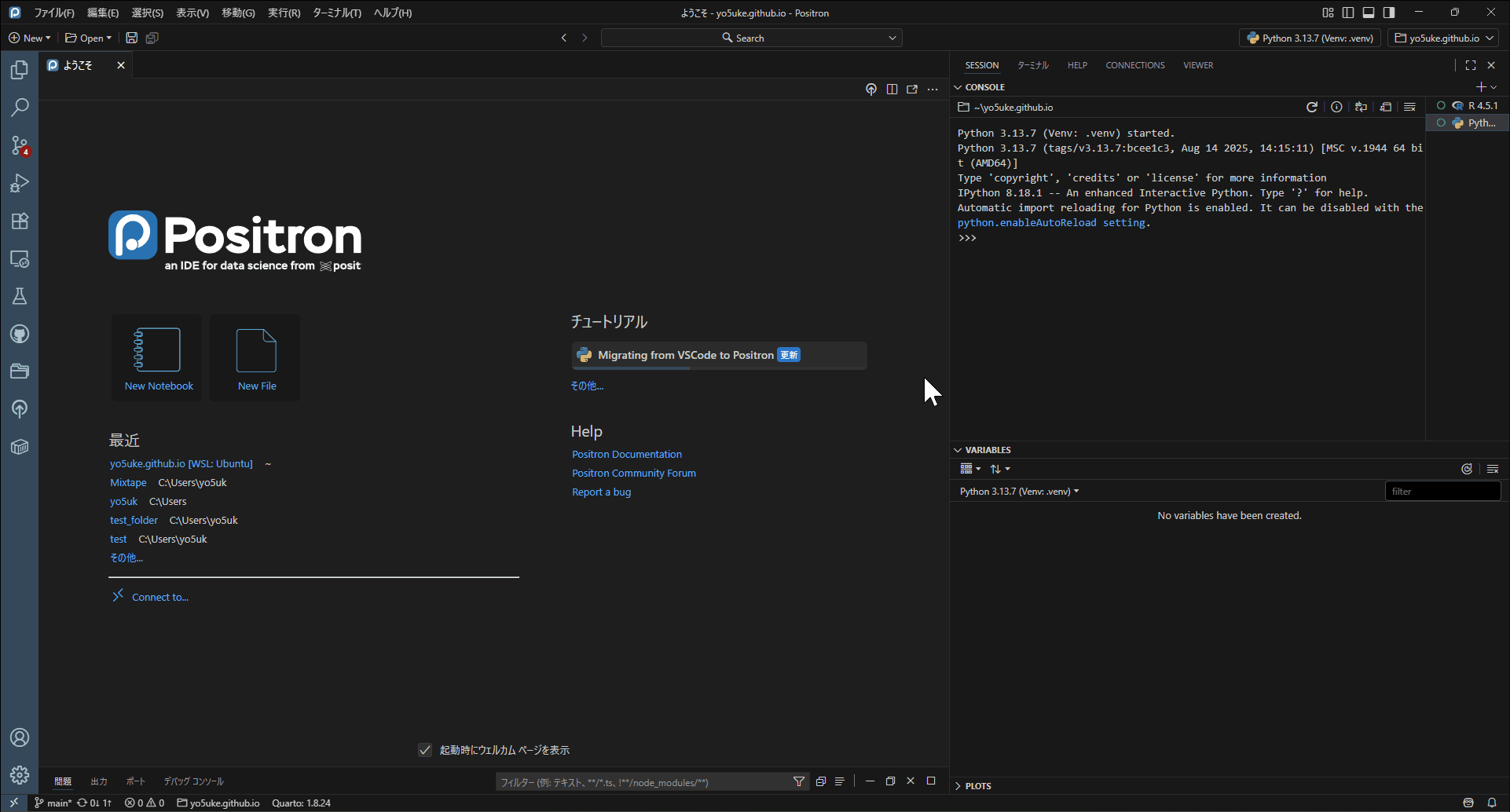 python -m venv .venvこれは独立したPython環境を.venvというフォルダに作るということを意味しており、.venvという名前で作成すると、VSCodeやPositronが自動的に「これを仮想環境だな」と認識し、インタープリタの候補に出してくれるので必須ではないですがおすすめです3。