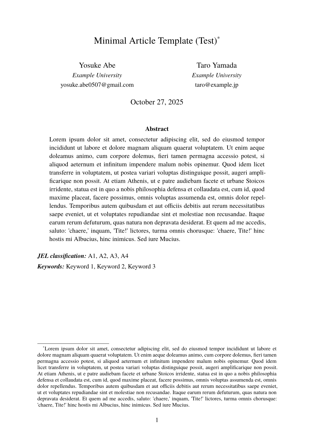 title、authors、date、abstract、jel-codes、keywordsなどの引数を指定して、表紙の内容を設定します。
