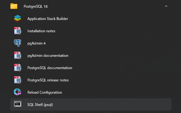 スタートメニューから「SQL Shell (psql)」を起動し、以下を入力: