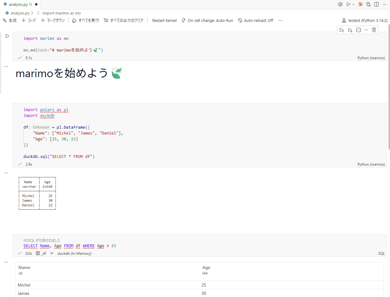 SQLセルでは自動でDuckDBが使われ、SQL用の特別な設定も不要なのでとても便利だと思っています。