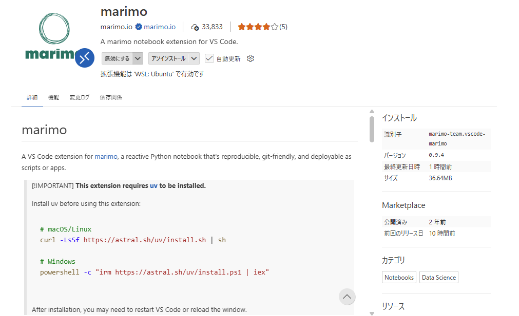 marimoはuvを使ってインストールすることができ、先ほどのコマンドでインストールされているので、導入は簡単です。