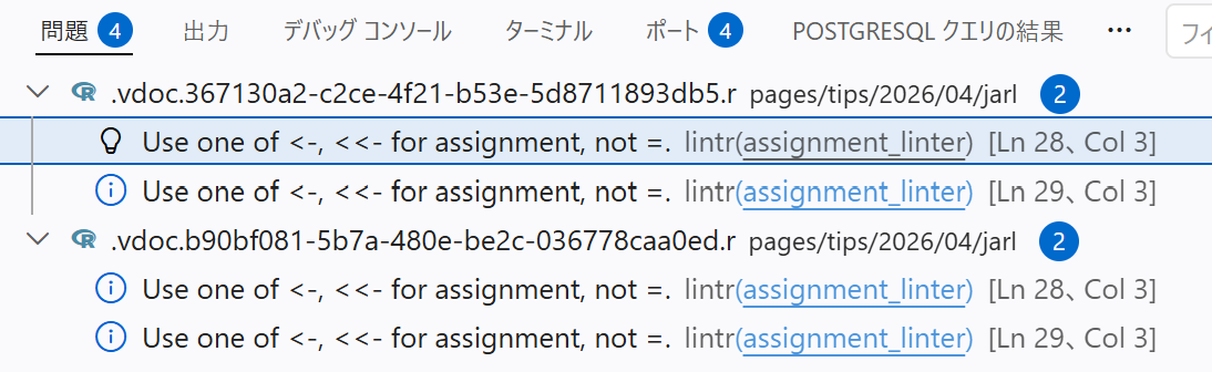 リンターはコードの品質をチェックするツールであり、コードのスタイルや構文エラー、潜在的なバグなどを検出します。lintrはRのコードを解析し、これらの問題を指摘してくれます。